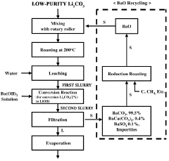 - A method involving heat treatment of low-purity lithium carbonate with barium hydroxide or barium oxide, followed by leaching and filtration to separate lithium hydroxide, and subsequent evaporation, which minimizes lithium loss and uses barium compounds to enhance purity and reduce energy consumption.