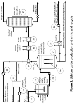 - Synthesis of lithium-containing compounds via nitrate-oxide reactions: The reaction between lithium nitrate and lithium oxide serves as a pathway for synthesizing various lithium-containing compounds used in energy storage and conversion technologies. These reaction pathways can be controlled to produce specific lithium compounds with desired properties. The synthesis methods often involve precise temperature control, specific reaction environments, and carefully selected precursors to achieve the target compounds with high purity and performance characteristics.