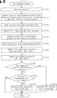 - An engine fuel diagnosis device that includes an inclination detection section, a first estimating section, and a diagnosing section to detect the usage state of unexpected fuels by computing the deviation between estimated and actual vehicle accelerations, allowing for correction of input torque calculations and hydraulic pressure adjustments.