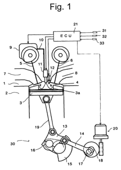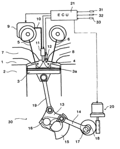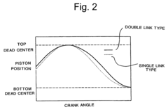 - Implementing a multi-link piston crank mechanism that controls piston motion to reduce acceleration at top dead center, combined with lean combustion modes that adjust air-fuel ratios and compression ratios based on engine operating conditions, allowing the engine to operate at leaner air-fuel ratios and adjust compression ratios dynamically.