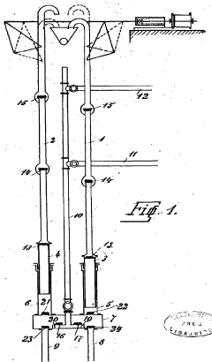 - A water engine design featuring two rising-pipes acting as plungers in pump-cylinders, with a collecting-pipe system and return-valves that allow alternating operation to lift water from both upper and lower drifts using a single engine, minimizing power loss and enhancing pumping speed.
