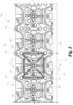 Specialized cooling systems for LT4 engine cylinder heads incorporate optimized coolant passages and flow distribution to manage thermal loads effectively. These systems feature strategic placement of cooling channels around critical areas such as valve seats and combustion chambers to prevent hotspots and maintain optimal operating temperatures. Advanced cooling technologies include directed coolant jets and variable flow control mechanisms that adjust cooling intensity based on engine operating conditions, helping to maintain performance while preventing thermal stress.Expand Specific Solutions03 Valve train optimization for performance
