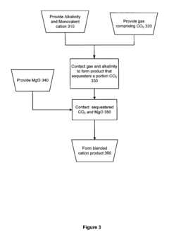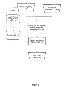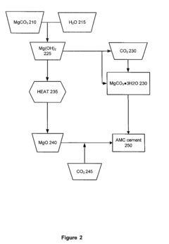 - Magnesium carbonate-based CO2 capture in industrial processes: This method focuses on integrating magnesium carbonate-based CO2 capture systems into industrial processes, particularly in high-emission sectors. The technique involves using magnesium carbonate to absorb CO2 from flue gases or process streams, effectively reducing industrial carbon emissions while potentially producing valuable by-products.