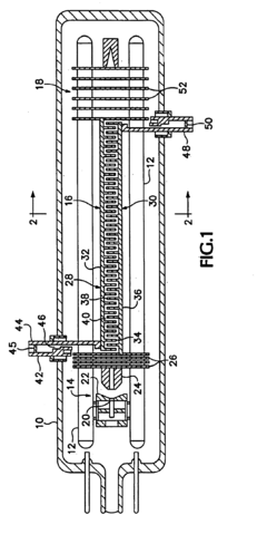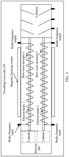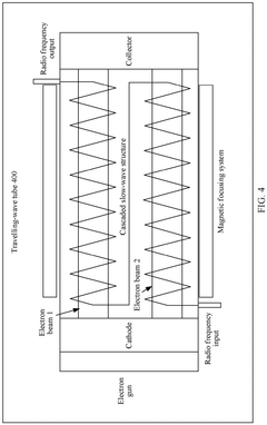 Technical Solution: Thales has developed advanced Traveling Wave Tube (TWT) technology for satellite communications and radar systems. Their TWT solutions utilize helical slow-wave structures and innovative cathode designs to achieve higher power efficiency (up to 70%) and broader bandwidth operation (several GHz). Thales implements proprietary thermal management techniques that extend TWT operational lifetimes to over 15 years in space applications. Their TWTs feature multi-stage collectors that recover energy from spent electron beams, significantly improving overall efficiency compared to magnetrons. For military and aerospace applications, Thales has engineered TWTs with enhanced resistance to electromagnetic pulse effects and radiation hardening techniques that ensure reliable operation in harsh environments. Their manufacturing process incorporates precision automated assembly and rigorous testing protocols to maintain consistent performance across production units.