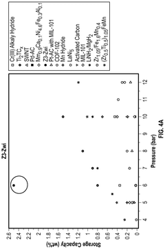 Strengths: Exceptional surface area optimization, strategic metal doping for improved binding energies, and integrated systems approach combining multiple storage mechanisms. Weaknesses: Still requires cryogenic temperatures for optimal performance, presenting challenges for practical on-board vehicle applications and requiring sophisticated thermal management systems.