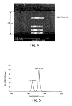 Technical Solution: GaN Systems has pioneered advanced material selection techniques for GaN transistor fabrication, focusing on their patented Island Technology® that uses a unique die design to optimize thermal performance and reliability. Their approach incorporates high-purity GaN epitaxial layers grown on silicon carbide (SiC) substrates to maximize electron mobility while minimizing defects. The company has developed proprietary surface passivation techniques using optimized dielectric materials that significantly reduce current collapse and dynamic RDS(on) degradation. Their fabrication process includes specialized buffer layer architectures that manage lattice mismatch between GaN and substrate materials, reducing dislocation densities to below 10^8 cm^-2. GaN Systems also employs advanced metal stack configurations for ohmic contacts, utilizing Ti/Al/Ni/Au multilayers with precise thickness ratios and annealing profiles to achieve contact resistances below 0.5 Ω·mm.