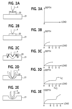 - A nondestructive depth sensing indentation technique using a nanoindentation apparatus with a variable load to measure adhesion strength by detecting the critical load and penetration depth rate, allowing for in-situ testing of thin films on substrates without damaging the film, and calculating adhesion strength through critical stress and shear force calculations.