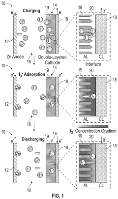 The composition and properties of electrolytes play a crucial role in determining the coulombic efficiency of zinc-ion batteries. Electrolyte modifications include the addition of specific additives, pH adjustment, concentration optimization, and the use of gel or solid-state electrolytes. These modifications can suppress hydrogen evolution, reduce zinc corrosion, and promote the formation of stable solid electrolyte interphase (SEI) layers, all contributing to improved coulombic efficiency.Expand Specific Solutions03 Interface engineering strategies for ZIBs