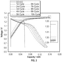 Technical Solution: Samsung SDI has developed a comprehensive coulombic efficiency measurement framework for zinc-ion batteries that addresses the unique challenges of aqueous electrolyte systems. Their approach incorporates multi-parameter correction factors that account for side reactions including hydrogen evolution, oxygen reduction, and zinc dendrite formation. The company employs high-precision electrochemical impedance spectroscopy (EIS) at various state-of-charge points to isolate and quantify parasitic reactions that affect CE measurements. Samsung's methodology includes standardized protocols for electrolyte preparation with controlled water content and oxygen levels, as these factors significantly impact measurement reproducibility. Their advanced testing system incorporates real-time monitoring of zinc electrode morphology changes using in-situ microscopy techniques correlated with electrochemical data to provide more accurate CE values that reflect actual energy storage capability rather than just charge transfer.