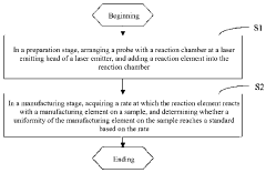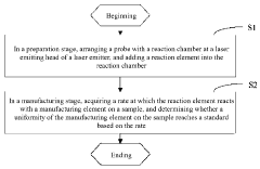 - A testing method involving a probe with a reaction chamber at the laser emitter head, where a reaction element reacts with the manufacturing element, and the reaction rate is monitored using an elemental analyzer to ensure uniformity and stress analysis through temperature distribution, with automated emergency stop mechanisms to prevent damage.