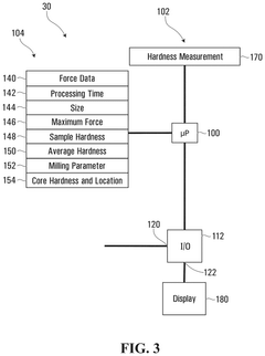 Technical Solution: Mitutoyo has developed advanced microhardness testing systems specifically designed for measuring hardness variations in minerals like rhodochrosite. Their HR-600 series incorporates precision diamond indenters with load cells capable of detecting minute differences in material resistance. The technology employs automated multi-point mapping that creates detailed hardness distribution profiles across heterogeneous mineral samples. Their proprietary AVPAK software integrates with scanning electron microscopy (SEM) data to correlate hardness measurements with microstructural features. For rhodochrosite specifically, Mitutoyo has calibrated their systems to account for the mineral's unique crystalline structure and variable manganese carbonate composition, allowing for accurate measurements across different sample orientations. The system can detect hardness variations as small as 0.5 HV (Vickers Hardness) between different growth zones within rhodochrosite crystals.