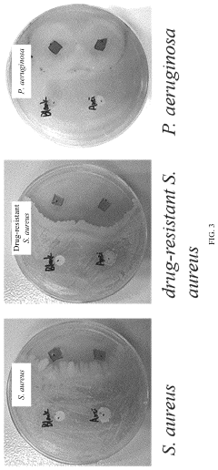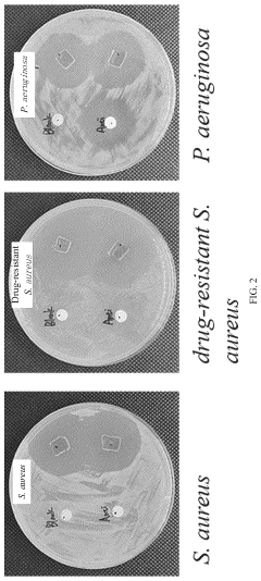 Strengths: Multi-modal antimicrobial action reduces likelihood of bacterial resistance; controlled release systems allow for sustained antimicrobial activity; biocompatible materials suitable for medical applications. Weaknesses: Some formulations require external stimuli (like light) limiting application scenarios; potential cytotoxicity concerns with certain antimicrobial agents; manufacturing complexity may increase production costs.
