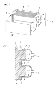Technical Solution: Toray has developed advanced hollow fiber membrane bioreactor (MBR) modules utilizing polyvinylidene fluoride (PVDF) materials with optimized pore structure. Their MEMBRAY® series features outside-in filtration that reduces fouling by up to 30% compared to conventional designs[1]. The modules incorporate proprietary braided fiber technology that enhances mechanical strength while maintaining high permeability (>1,000 LMH/bar). Toray's hollow fiber modules employ automated air scouring systems that create efficient two-phase flow patterns around the fiber bundles, significantly reducing membrane fouling and extending cleaning intervals to 3-6 months[2]. Their latest generation modules feature improved chemical resistance allowing for maintenance cleaning with 500-1000 mg/L sodium hypochlorite and recovery cleaning with up to 3000 mg/L, while maintaining membrane integrity over a 5+ year operational lifespan.