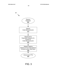 Various fabrication techniques are employed to manufacture metal oxide TFTs, including sputtering, atomic layer deposition (ALD), solution processing, and chemical vapor deposition (CVD). These methods control the crystallinity, composition, and interface quality of the metal oxide layers. Post-deposition treatments such as annealing in different atmospheres help optimize the electrical properties and stability of the devices. Advanced patterning techniques enable the creation of high-resolution TFT structures for display and integrated circuit applications.Expand Specific Solutions03 Device structures and architectures for metal oxide TFTs