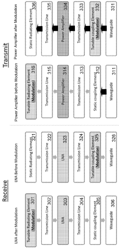 - Incorporating low noise amplifiers (LNAs) and power amplifiers (PAs) into the metasurface to amplify signals closer to the radiating elements, distributing amplification to reduce heat and loss, and integrating tunable devices for beamforming and phase adjustments.