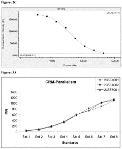 Technical Solution: Shimadzu Corporation has developed an advanced microfluidic ELISA platform for multiplexed protein quantification that integrates with their established analytical instrumentation expertise. Their system employs a hybrid approach combining microfluidic sample handling with high-sensitivity detection technologies. The Shimadzu platform utilizes glass or polymer microchips with etched microchannels (typically 20-50 μm in width) arranged in a branching network that enables parallel processing of samples. Their technology incorporates precision fluid control through integrated micropumps and electrokinetic flow mechanisms that ensure accurate delivery of nanoliter-scale reagent volumes. For multiplexed detection, Shimadzu employs a combination of spatially-resolved detection zones and spectrally distinct fluorescent labels, enabling simultaneous quantification of up to 8 different protein targets from a single 20 μL sample. The system achieves exceptional sensitivity through integration with their mass spectrometry technology for label-free protein quantification or through advanced fluorescence detection with avalanche photodiode arrays. Shimadzu's microfluidic ELISA platform has been applied to pharmaceutical development for protein biomarker discovery, clinical diagnostics for cancer screening, and food safety testing, demonstrating detection limits in the sub-pg/mL range with analysis times of approximately 25-40 minutes.