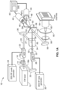 - A parallel flow cytometry system utilizing a FIRE optical engine with radio-frequency-tagged emission (FIRE) and a microfluidic device, enabling simultaneous probing of multiple flow channels with independent optical sensitivity and a single PMT detector for fluorescence analysis, allowing for higher throughput and cost-effective compound screening.