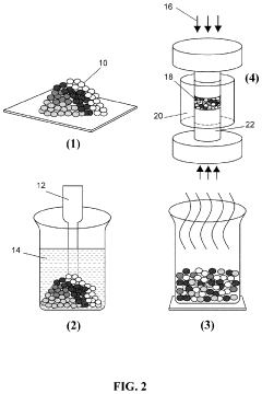 Technical Solution: Forschungszentrum Jülich has developed advanced in-situ characterization methodologies to study microstructural evolution during Na3PS4 sintering with unprecedented temporal and spatial resolution. Their approach combines synchrotron-based X-ray diffraction with specialized sample environments that enable real-time monitoring of crystallization, phase transitions, and densification processes. Their research has revealed distinct sintering stages in Na3PS4, including initial particle rearrangement (80-120°C), onset of surface diffusion (150-180°C), and bulk diffusion-dominated densification (220-300°C). They've identified critical correlations between processing atmosphere purity and resulting microstructure, demonstrating that even trace moisture levels (<10ppm) significantly alter grain boundary chemistry and subsequent ionic conductivity. Forschungszentrum Jülich has pioneered the use of field-assisted sintering techniques (FAST/SPS) for Na3PS4, achieving fully dense electrolytes with minimal grain growth through rapid processing (5-15 minutes) at moderate temperatures (200-250°C).
