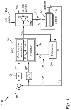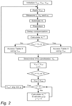 - The method involves predefining an initial voltage vector and using a lookup table to select a group of candidate voltage vectors, calculating a cost function based on the deviation between predicted and reference stator flux, and applying the primary voltage vector that minimizes this cost function, thereby reducing computation and eliminating the need for flux weighting factors.