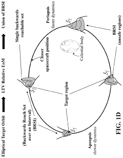 - A fail-safe control policy utilizing backwards reachable sets and model predictive control (MPC) is implemented to compute unsafe regions around the target, formulating these as passive safety constraints for online trajectory generation, ensuring the chaser spacecraft avoids collision trajectories even in the absence of thruster control.