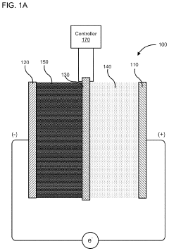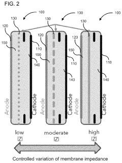 Optimizing operating parameters such as applied voltage, flow rate, and cycle time is essential for efficient ion transport in membrane capacitive deionization cells. The applied voltage affects the ion adsorption capacity and energy consumption, while the flow rate influences the residence time and mass transfer characteristics. Proper cycling between adsorption and desorption phases can maximize salt removal efficiency and minimize energy requirements. Advanced control strategies, including variable voltage operation and multi-stage configurations, can further enhance the performance of the deionization process.Expand Specific Solutions05 Novel cell architectures for improved performance