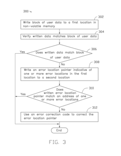 - A method that writes data to a first location in non-volatile memory, verifies the written data, and if errors are found, writes an error location pointer to a second location, ensuring the pointer's integrity, thereby increasing data rate and reducing read latency and data loss.