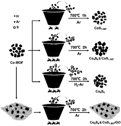 - By using metal-organic framework (MOF) as the precursor, using in-situ sulfidation method and adjusting the calcination time and atmosphere, four cobalt sulfide catalysts were prepared, including CoS1.097, Co9S8, Co9S8&CoS1.097 and Co9S8&CoS1.097/rGO. The MOF itself contains S and N to avoid external sulfur sources, and the conductivity is enhanced through graphene to improve electrocatalytic performance.