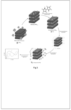 Development of composite materials combining MXenes with other nanomaterials such as graphene, carbon nanotubes, metal oxides, and polymers. These composites leverage the synergistic effects between MXenes and other components to achieve enhanced properties for various applications. The hybridization strategies include layer-by-layer assembly, in-situ growth, and solution mixing to create materials with improved mechanical, electrical, and electrochemical properties.Expand Specific Solutions04 MXenes for electromagnetic interference shielding and absorption