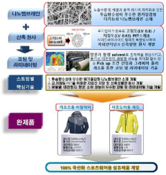 - A nanomembrane material with high-low viscosity PET side-by-side yarn is used, laminated with PU resin and MEK solvent, incorporating additives for antistatic, antibacterial, and light heating functions, to create a fabric with enhanced elasticity and UV protection.