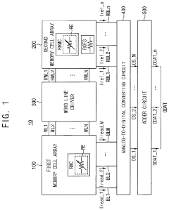 - Incorporating a second memory cell array with offset resistors connected in parallel, using the same resistive material as the first memory cell array, to convert read currents into digital signals, thereby mitigating temperature and time dependency, and ensuring consistent resistance across offset resistors for enhanced sensing performance.