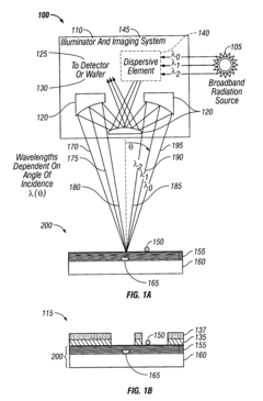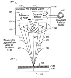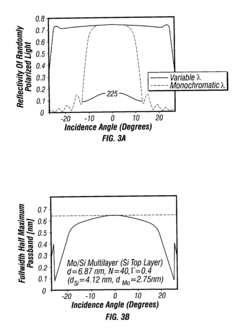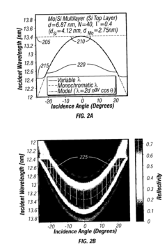 - Modulating the radiation wavelength and incident angle on reflective masks and mirrors in EUVL systems to increase the usable numerical aperture and resolution, utilizing a spectrally dispersive optical element and graded multi-layer coatings to enhance reflectivity across a range of angles and wavelengths.