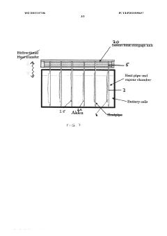 - A battery arrangement featuring a vapor chamber in direct contact with battery cells and heat pipes connected to a heat exchanger, utilizing latent heat accumulators and phase change materials to rapidly absorb and dissipate heat, ensuring efficient temperature control and preventing overheating.