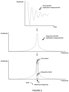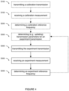 - A software-based calibration method is employed to adjust transmission parameters and correct for frequency drift, utilizing a magnet array, transmitter, and receiver to sample calibration and experiment measurements, with a focus on reducing delay and improving accuracy by using small tip angles and thermal regulation.