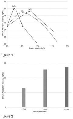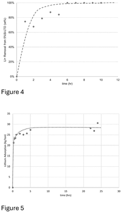 Composite and hybrid materials combine the advantages of different types of sorbents to achieve enhanced lithium selectivity. These materials typically consist of an inorganic component (such as metal oxides or silica) and an organic component (such as polymers or organic ligands). The synergistic effect between the components results in improved lithium selectivity, capacity, and kinetics. These hybrid materials can be designed with hierarchical structures to facilitate mass transfer and provide multiple lithium binding sites, resulting in efficient and selective lithium extraction from complex brines and other sources.Expand Specific Solutions05 Novel nanomaterials and surface-modified sorbents