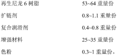 - By adding a chain extender and a specific portion of toner to the raw materials, combined with a composite lubricant and reinforcing materials, chemical chain extension is used to modify the regenerated nylon 6 resin to improve its mechanical properties and thermal stability, and through a specific composition According to the proportion and process conditions, a regenerated nylon 6 material with excellent color change resistance was prepared.