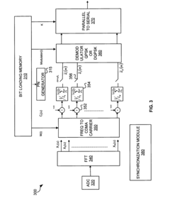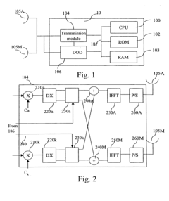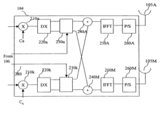 Technical Solution: Samsung has pioneered a dual-mode transmission system that leverages the strengths of both OFDM and MC-CDMA technologies. Their approach implements a frequency-domain analysis engine that continuously evaluates channel conditions across the spectrum band and dynamically allocates subcarriers to either OFDM or MC-CDMA modulation schemes. In environments with consistent channel characteristics, Samsung's system favors OFDM for its higher spectral efficiency and simpler receiver architecture. However, when frequency-selective fading is detected, the system seamlessly transitions affected subcarriers to MC-CDMA to exploit its inherent frequency diversity advantages. Samsung has implemented this technology in their network infrastructure equipment, demonstrating a 25% improvement in average throughput and up to 50% better performance at cell edges compared to pure OFDM systems. Their solution also incorporates advanced interference cancellation techniques specifically optimized for the hybrid transmission approach.