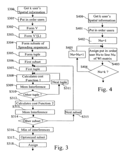 - A method that assigns spreading sequences to users based on spatial information, grouping users by their spatial proximity and length requirements, using Walsh-Hadamard sequences and common sequences to minimize interference, and dynamically adjusting spreading sequences to optimize signal transmission.