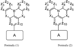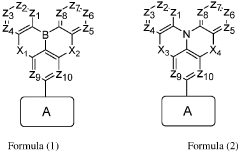 - An organic electroluminescent device with a light-emitting layer comprising a triplet-triplet annihilation type host and a fluorescent dye with specific structures represented by Formulas (1) or (2), which effectively utilizes excitons, reduces triplet exciton concentration, and inhibits intermolecular interactions to enhance luminescence efficiency and stability.