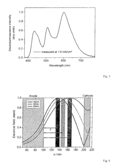 The efficiency of OLED lighting can be enhanced through structural optimization of the device layers. This includes implementing multi-layer structures with precisely controlled thicknesses, utilizing light extraction technologies such as microlens arrays or scattering layers, and incorporating optical outcoupling structures. Tandem OLED structures with multiple emission units connected in series can also significantly improve efficiency. These structural optimizations help extract more light from the device and reduce internal losses.Expand Specific Solutions04 Hybrid lighting systems combining OLED and fluorescent technologies
