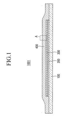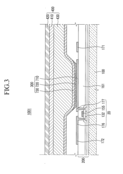 Technical Solution: Samsung Display has developed advanced OLED self-healing technology that utilizes dynamic molecular restructuring to repair minor scratches and pixel defects. Their approach incorporates self-healing polymers with thermally activated healing mechanisms that can restore damaged areas when exposed to moderate heat (around 60°C). Samsung's technology employs a multi-layered structure where the self-healing layer is integrated between the substrate and the active OLED components. This allows for continuous repair of microcracks without compromising display performance. For encapsulation, Samsung utilizes thin-film encapsulation (TFE) technology with alternating inorganic (SiNx) and organic layers that provide superior moisture and oxygen barrier properties while maintaining flexibility. Their latest generation incorporates atomic layer deposition (ALD) techniques to create ultra-thin but highly effective barrier films with water vapor transmission rates below 10^-6 g/m²/day.