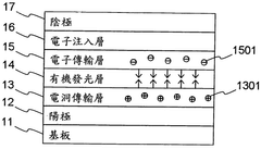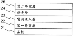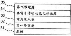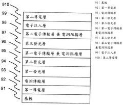 - The OLED device structure includes multiple light-emitting layers with specific compositions near the anode and cathode ends, allowing it to emit different wavelengths of visible light based on voltage, enabling white light or other colors with specific color temperatures through voltage adjustment alone.