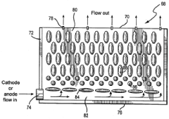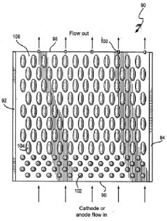 - The design incorporates stamped or machined flow fields with dimples or protrusions to provide uniform flow resistance and flexibility in pressure drop, featuring center aisles with staggered rows of circular or elliptical flow barriers and varying channel widths or diameters to enhance flow velocity and mixing, ensuring uniform current density and performance.