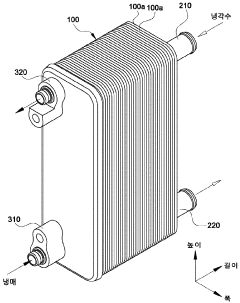 - A multi-pass heat exchanger design where heat exchange plates are stacked to form flow paths with an inlet and outlet on the same side, utilizing a partition and isolation flow parts to create multiple passes and allowing the inlet and outlet to be aligned in the same direction, improving mountability and manufacturing efficiency.