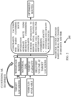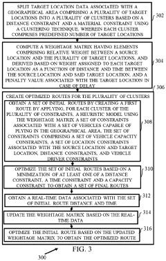 - A method and system that split target locations into clusters based on distance and material constraints, compute a weightage matrix considering distance, time, and penalty values, and apply heuristic models to optimize routes, dynamically updating the matrix with real-time data to ensure optimal vehicle utilization and route efficiency.