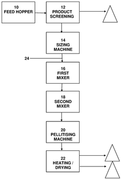 Technical Solution: Tianqi Lithium has developed a multi-stage pelletization process specifically designed for lithium ore concentrates that incorporates a proprietary binder formulation and controlled moisture content management. Their approach utilizes a combination of disc pelletizers with precise rotation speed control and residence time optimization to create spherical pellets with enhanced structural integrity. The process includes a pre-conditioning phase where fine lithium ore particles are mixed with carefully selected organic and inorganic binders that form strong bridges between particles during the subsequent induration phase. Tianqi's system incorporates real-time monitoring of pellet green strength and moisture distribution, allowing for adaptive control of the pelletization parameters. Their technology also features a specialized curing protocol with controlled temperature and humidity profiles that significantly reduces micro-fractures during the drying and hardening stages.