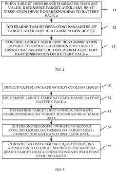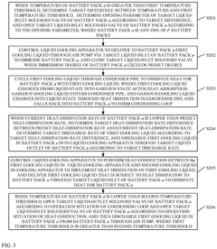 - A battery heat-dissipation processing method and apparatus that utilize a liquid cooling system with a condenser pipe, solenoid valves, and a cooling apparatus to control the flow and cycling of a first cooling liquid, optimizing heat dissipation through controlled immersion and condensation loops.