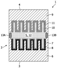 - Miniaturized electrode geometries for microelectronics: As electronic devices continue to shrink, specialized electrode geometries at the micro and nano scales become increasingly important for power management. These miniaturized electrode designs enable efficient power delivery in confined spaces while managing heat dissipation. Advanced fabrication techniques allow for complex three-dimensional electrode structures that maximize performance in limited volumes, supporting the development of more powerful yet compact electronic systems.
