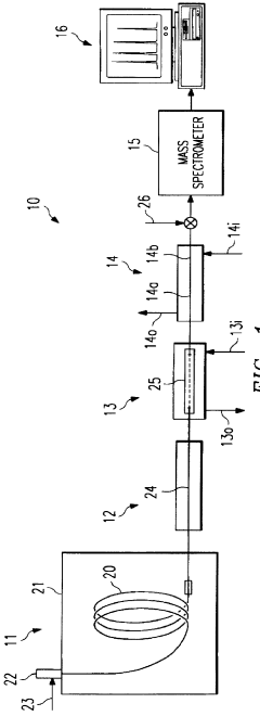 Technical Solution: Thermo Finnigan (now part of Thermo Fisher Scientific) has pioneered the development of digital flow control technology for GC-MS systems. Their approach focuses on optimizing carrier gas flow through advanced algorithms that dynamically adjust flow parameters throughout analytical runs. The company's proprietary OptiFlow technology maintains consistent linear velocity across temperature gradients, which is critical for preserving peak shape integrity. Their systems incorporate high-precision digital pressure controllers capable of sub-millisecond response times to pressure fluctuations. Thermo's technology also features intelligent compensation for atmospheric pressure changes and gas viscosity variations at different temperatures. Their latest innovations include predictive carrier gas optimization software that can recommend ideal flow parameters based on compound properties and column specifications, significantly reducing method development time while ensuring optimal chromatographic performance.