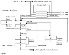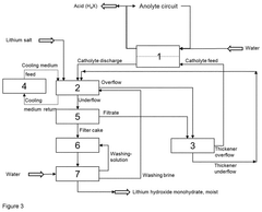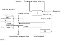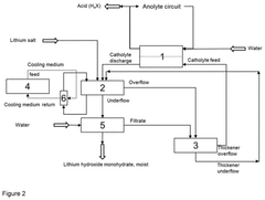 - The process involves electrochemically converting lithium salts into lithium hydroxide monohydrate by adding lithium salt to the lithium hydroxide solution emerging from the electrochemical apparatus, allowing precipitation without the need for evaporation crystallization, and regenerating the catholyte in a closed process, using cooling to manage heat and maintain constant chemical composition.