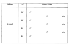 - The use of a molten nitrate electrolyte system with lithium nitrate or its mixtures, which provides stability for the lithium anode, supports oxygen reduction through nitrate ions, and operates at higher temperatures to enhance kinetics, reducing the need for expensive catalysts and minimizing the risk of flammability.